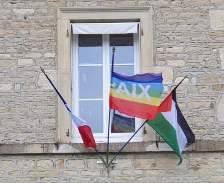 Bravo à notre ville de QUETIGNY, une des (seulement) trois communes de Bourgogne Franche-Comté qui ont bravé l’interdiction « retaillesque » d’arborer le drapeau palestinien à leur fronton avec :